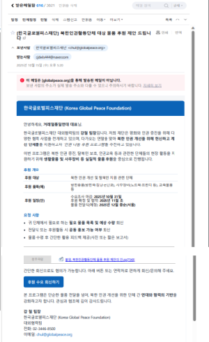 북한인권단체와탈북민인권활동가들을겨냥한해킹시도가잇따르고있다.최근‘한국글로벌피스재단(KoreaGlobalPeaceFoundation)’명의로위장한악성이메일이여러인권단체장과탈북민활동가들에게동시다발적으로발송된사실이확인되었다.이메일은행사협조나지원제안을가장하고있으며,첨부파일이나링크를클릭할경우악성코드가설치되어개인정보와단체내부자료가유출될위험이있는것으로알려졌다.전문가들은해당메일이북한의사이버공작조직이개입된정황이짙다고보고있다.현재탈북민인권단체들은오는10월22~24일‘2025서울북한인권세계대회’개최를앞두고막바지준비에한창이다.그러나행사준비에필요한자금과물품이부족한가운데,일부단체들은자체모금캠페인을벌이며어려운상황속에서도북한인권문제의국제적공론화를추진하고있다.이런절박한시점에‘이름있는재단’을사칭한해킹메일이유포되면서,지원요청메일로위장된사이버공격에속아피해를입는사례가속출하고있다.한탈북민단체김모씨는“메일내용이너무정교해실제협조제안으로착각해링크를클릭해피해를입었다”며“이시점의해킹시도는단순한사이버공격이아니라북한인권운동을직접적으로방해하려는의도적인테러로보인다”고밝혔다.현정부가북한과의평화공존정책을내세우며‘북한인권’이라는단어자체를공공영역에서자제시키는분위기가형성된가운데,인권단체들은국민의관심이식어가고있는상황에서도묵묵히활동을이어가고있다.그러나이같은해킹시도는인권운동의기반자체를위협하는명백한사이버공작행위로평가된다.보안전문가들은“공식기관이나재단을사칭한이메일이라도발신주소·링크클릭여부를반드시확인하고,첨부파일은즉시열지말아야한다”며주의를당부했다.북한인권단체들은이번사태를계기로공동대응체계를구축하고,정부와수사당국에신속한조사를요청할계획이다.[겨레얼통일연대사무국]